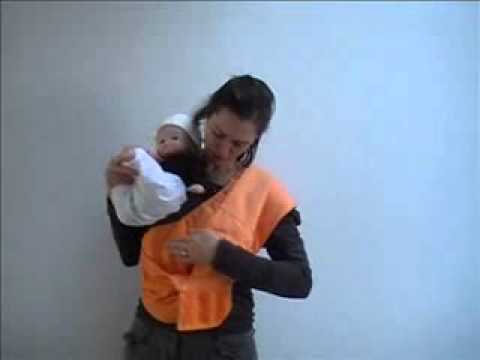 9.打開背巾的袋口扶著寶寶的屁股慢慢的放入袋中